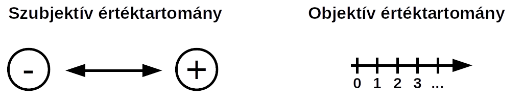 A szubjektív értékeink gyakran egy ellentétpárt használnak viszonyítási alapnak, míg az objektív értékek egy jól meghatározott nulla ponthoz viszonyítva értékelnek számszerű értékmennyiségekkel.