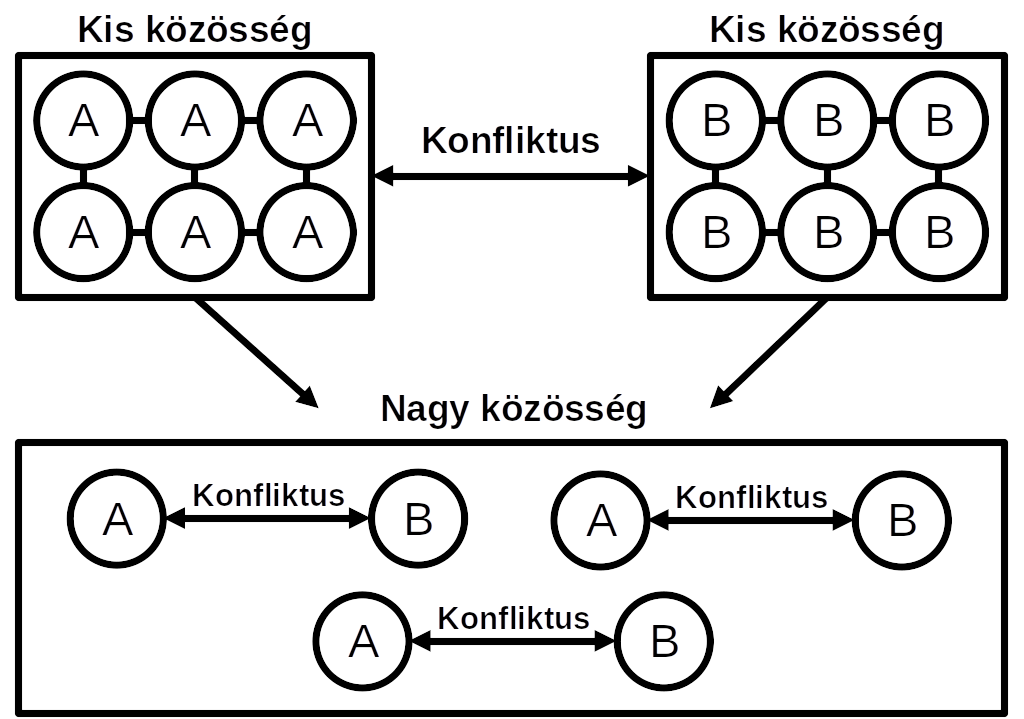 Az A és B értékrenszerű homogén csoportok összeolvadása a közösség atomizálódását okozza, ha A és B nem kompatibilisek egymással. A nagy homogén közösségek is idővel elvesztik a homogenitásukat, mert az értékrendszerek változnak, evolúciósan fejlődnek, nő a változatosságuk, ami társadalmi feszültségekhez vezethet.